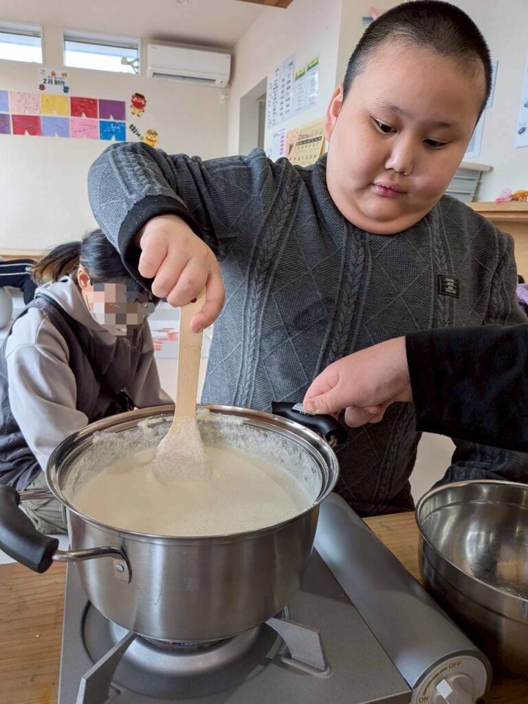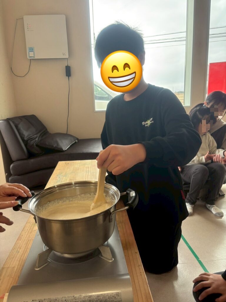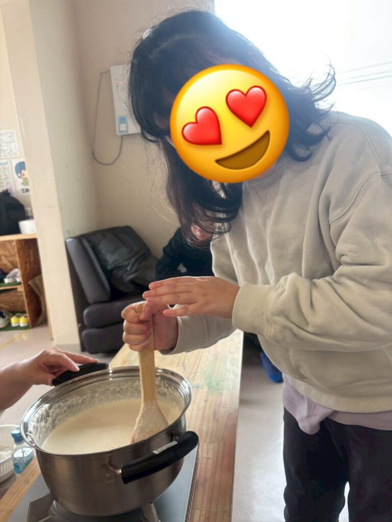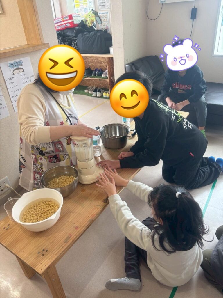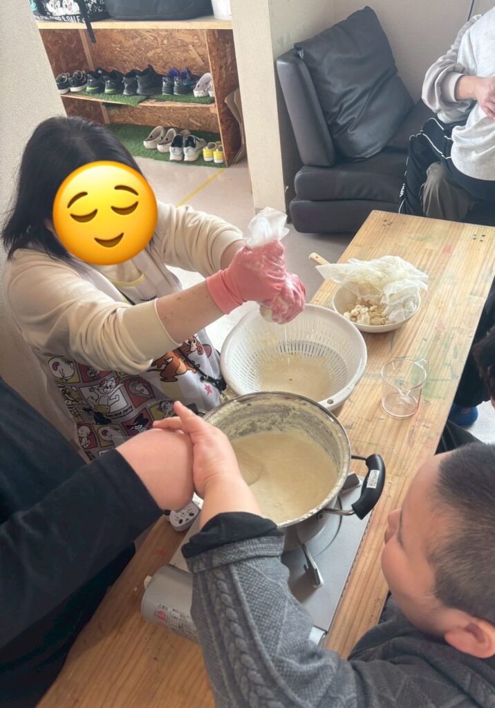 くろっく活動報告 投稿日 2026年3月4日 カテゴリー 活動内容紹介 【豆腐作り&プラバン作り】 大豆からお豆腐作りに挑戦しました! 大豆をミキサーにかけ始めるとみんなは興味津々✨ みんなでお鍋をゆっくりかき混ぜたりして美味しいお豆腐が出来上がりました✨ 出来立てのおからは最初は人気がなかったけど、おからドーナツに変身するとみんなの人気者に✨ 美味しく頂きました🥰 プラバンも自分の好きな絵を書いて、縮んでいく様子を見ながら完成させました! 自分で作ったものって最高ですよね✨