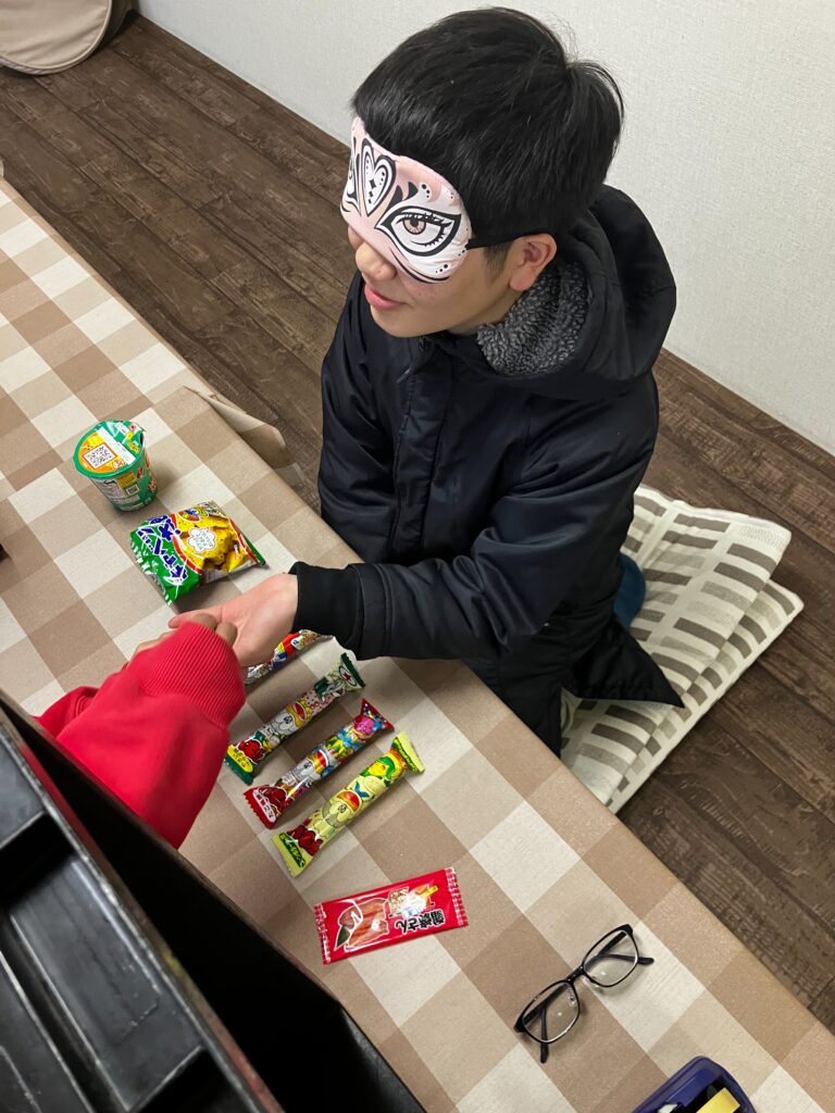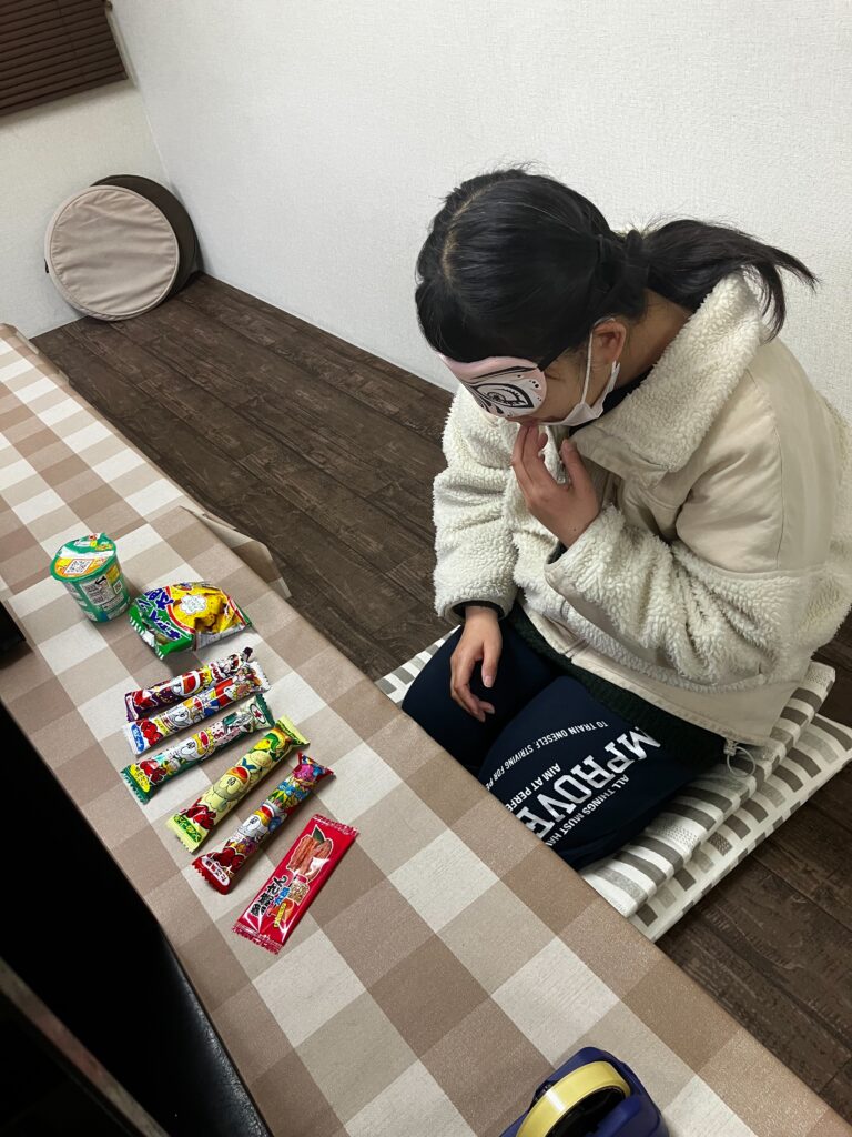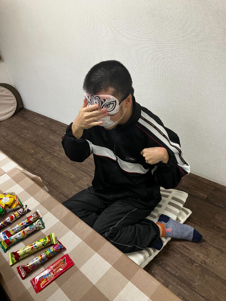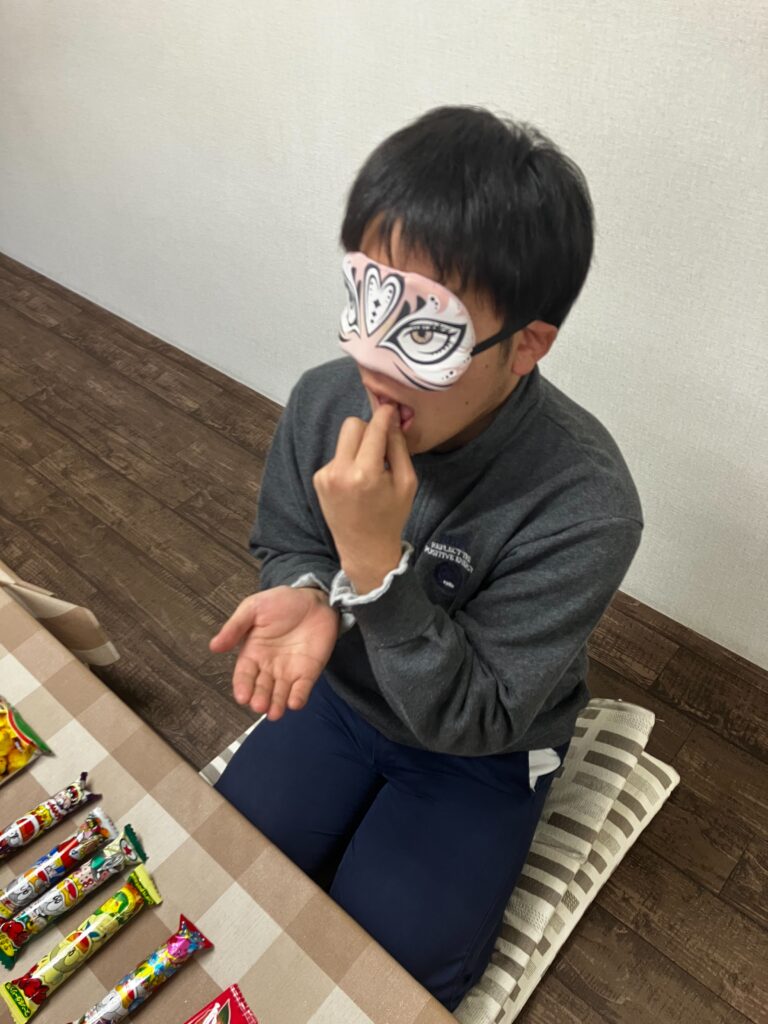 お餅を食べて、お菓子当てゲーム!さぁ目隠ししながら当てることができるかな!??